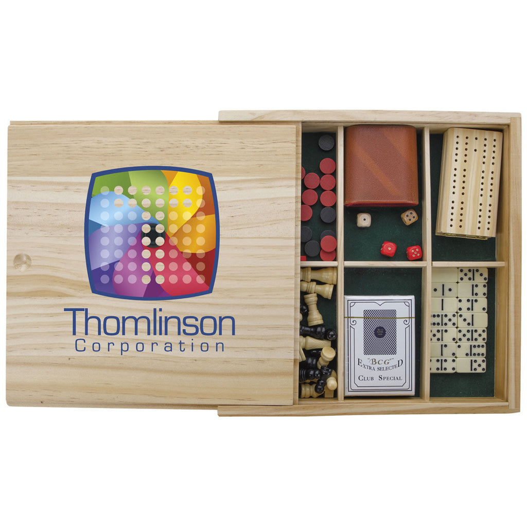 • Includes: Instruction sheet, board and pieces for checkers and chess, dominoe pieces, cribbage board and pegs, standard deck of cards, and dice set.