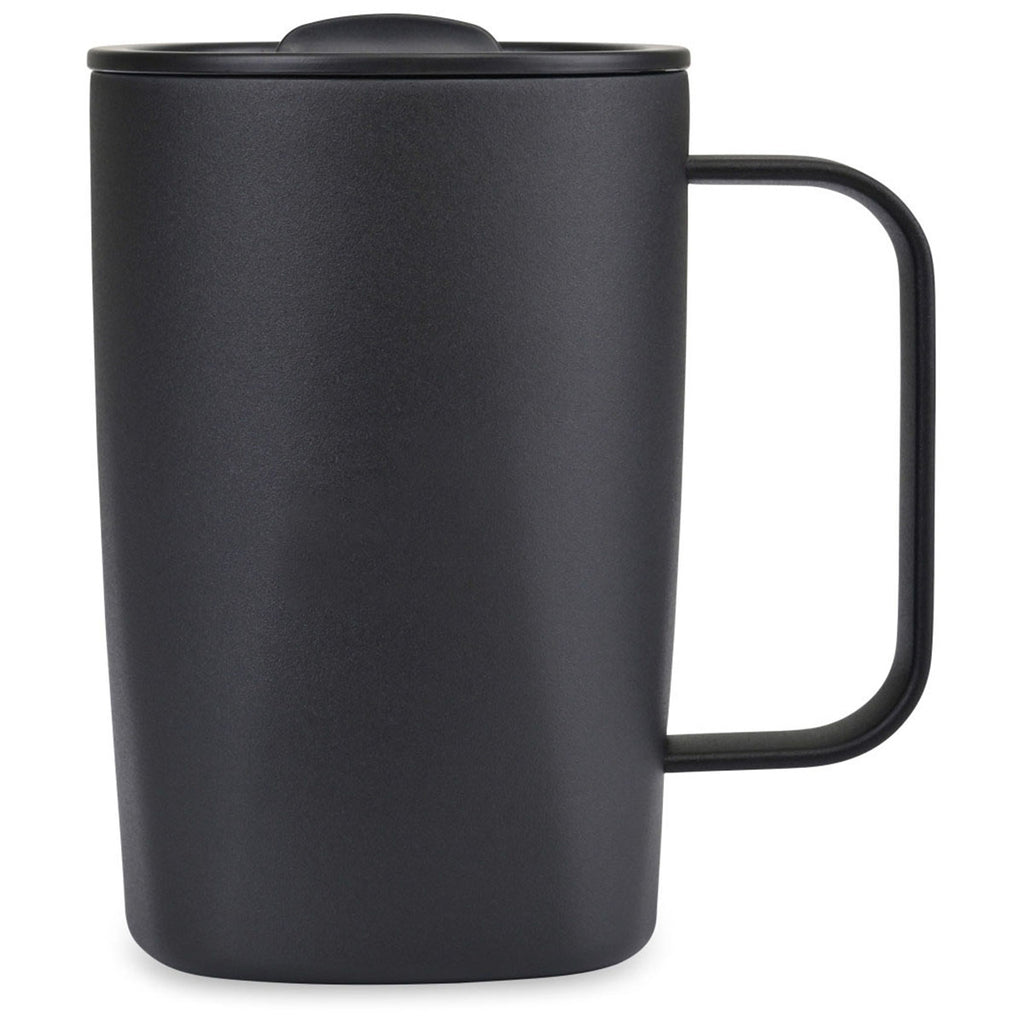 Aviana Black Rowan Recycled Mug - 15 Oz. with a corporate logo is a fun and eco-friendly way to offer guests coffee mugs that can be used as gifts. The stainless steel mug is sweatproof with a leak-resistant lid, making it great for coffee or tea on the go, on your morning commute, or as you lounge at home.