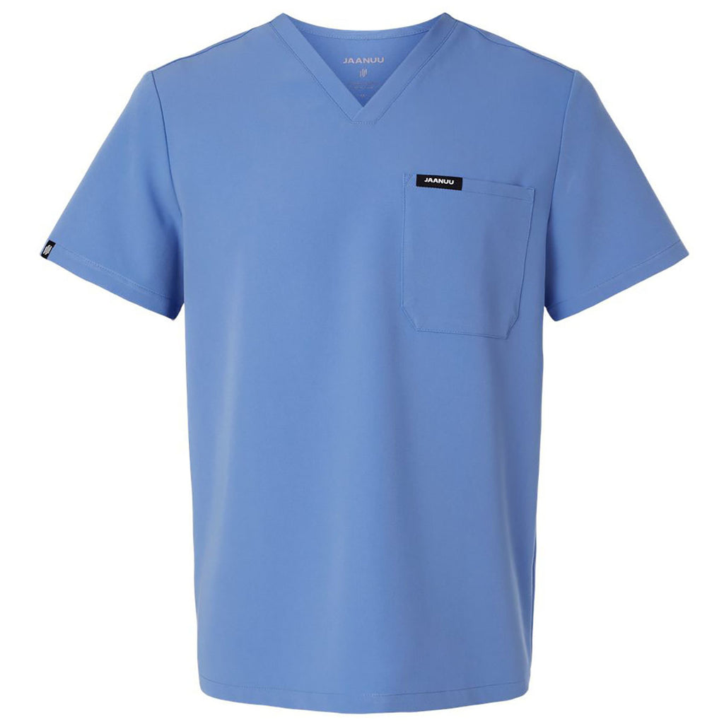 Jaanuu Men's Ceil Blue Holmes Everyday 1-Pocket Scrub V-Neck Top with a corporate logo offers a classic fit with moisture management properties. Made for the longest days at work, this scrub top is wrinkle and fade resistant whether you are saving lives, giving massages, or working with animals and need something easy to wash and wear.Corresponding Women's Style: Jaanuu Women's Ceil Blue Rhena Essential 1-Pocket Scrub V-Neck Top