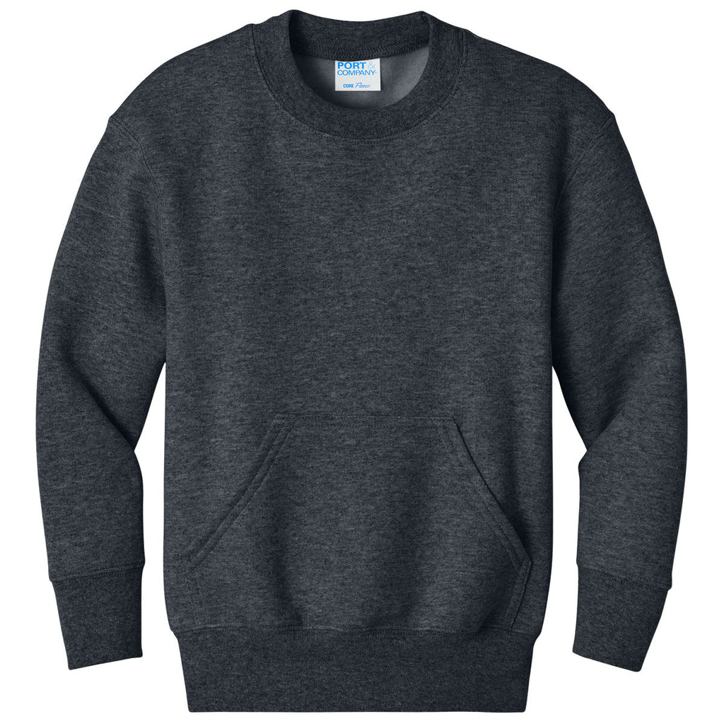 Corporate school or team programs benefit from the Port & Company Youth Dark Heather Grey Core Fleece Crewneck Pocket Sweatshirt. Its soft fleece and convenient pocket deliver comfort and function for everyday wear. Add a custom logo to create a branded sweatshirt that kids love to wear while proudly representing your organization or team spirit.Highlights