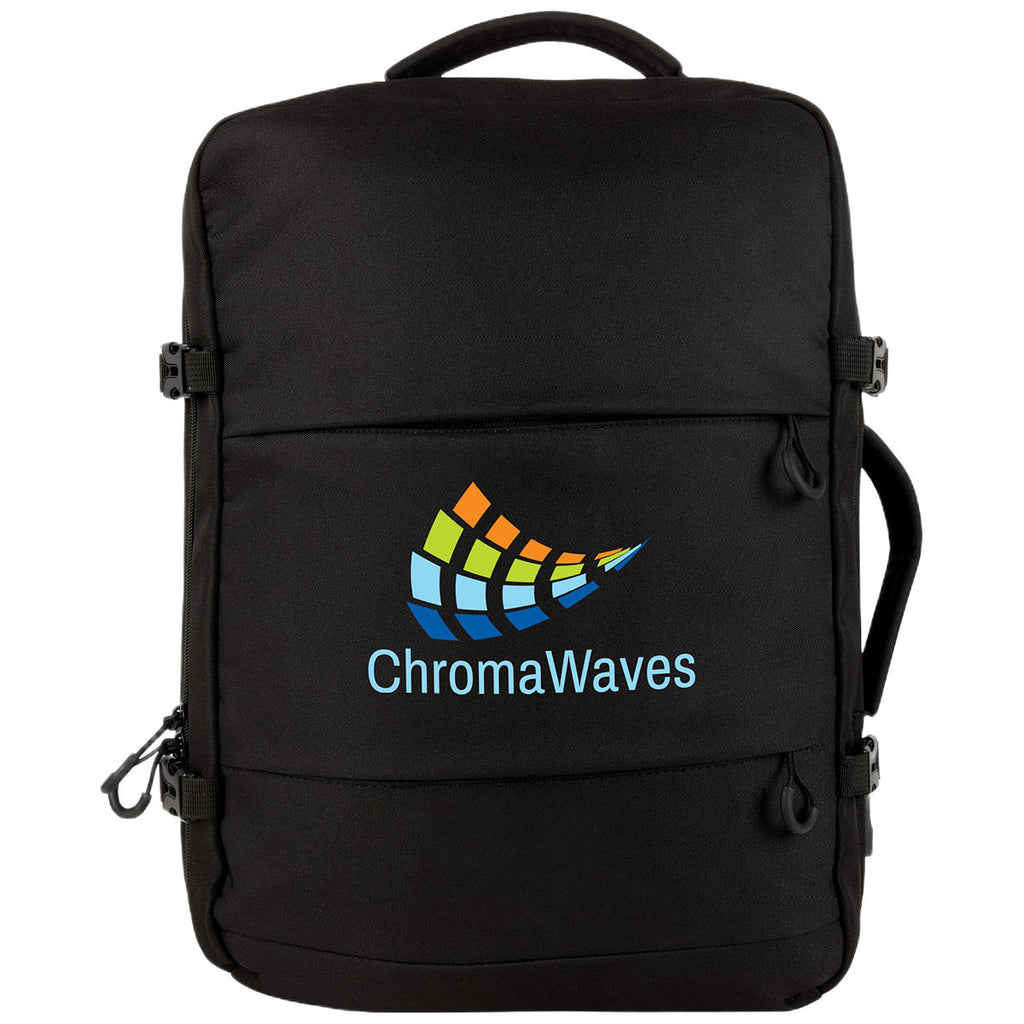 The Logomark Black Luca Overnighter Backpack delivers an innovative corporate solution for business travel, conferences, or remote work life. It features a padded laptop compartment, overnight storage, and a convenient trolley sleeve. Sleek and functional, it keeps your brand visible from airport lounges to boardrooms.