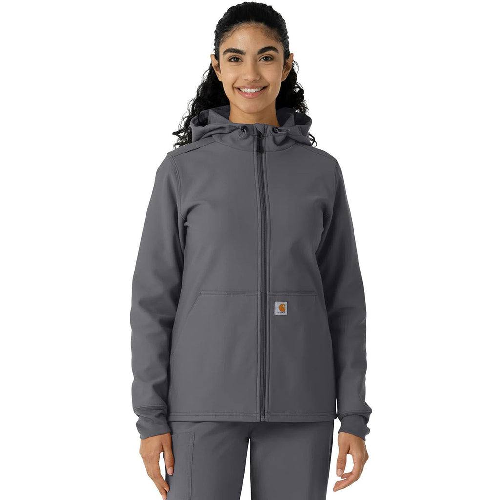 The Carhartt Women's Pewter Four-Pocket Bonded Fleece Hoodie is a functional and professional layering piece, ideal for healthcare uniforms and team apparel. Made from durable 100% polyester fleece, it offers lightweight warmth and flexibility. Designed with a three-piece hood, adjustable drawcord, and badge loop for workplace identification, this hoodie also features two front handwarmer pockets with flaps and an internal stethoscope pocket for added utility. The full-zip front with chin guard and slightly extended back hem provide a comfortable fit for active workdays. Add your logo to create a polished, branded layer suitable for cooler environments and healthcare team uniforms.
