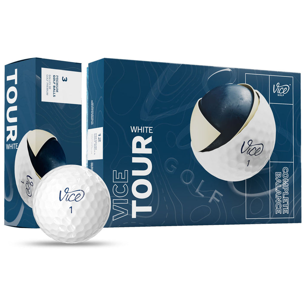 • The Vice TOUR ball is produces outstanding performance from tee to green. With the VICE TOUR ball you benefit from the technological improvements, including an updated hardness distribution, a higher coefficient of restitution (COR) and lower driver spin, which result in more distance off the tee. The new 312 dimple design features an increase in the diameter of dimples which reduces air resistance and results in a more stable trajectory of the golf ball and higher ball speed. The high spin around the green allows for aggressive shots to tough pin positions.