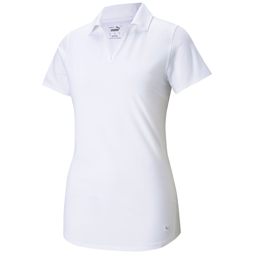Choose an embroidery for the Puma Golf Women's Bright White Cloudspun Free Golf Polo for a look that is just as great on the 18th hole as it is in the office. This simple, V-neck polo with cap sleeves is moisture wicking with CloudSpun fabric. The simple design does not distract from the quality of this polo. Add a company logo to use as employee apparel or even corporate apparel in more casual offices or for special events. Great when worn alone or pair this polo with a vest for a look all your own. Perfect to sell in a pro shop or as part of a larger logoed apparel line.
