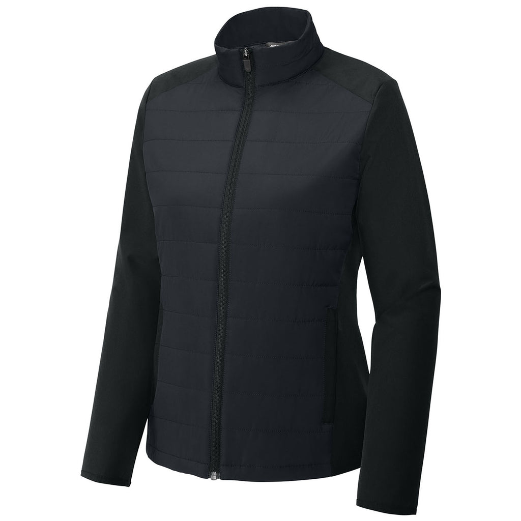 Corporate apparel meets performance with the Sport-Tek Women's Black Teknical Hybrid Jacket. Lightweight insulation and stretch fabric create warmth and flexibility, while a clean design keeps it professional. Add your custom logo for a branded jacket that transitions seamlessly from office to outdoors. Ideal for employees, clients, or active team members.Corresponding Men's Style: Sport-Tek Men's Black Teknical Hybrid Jacket