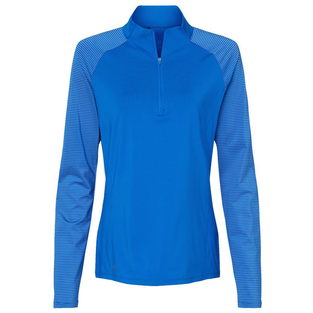 Adidas Women's Glory Blue Stripe Block Quarter-Zip Pullover with a corporate logo is a fun way to showcase your company or brand while promoting a healthy lifestyle. This sleek pullover offers moisture-management properties, UPF 50+ protection, and a self-mock collar so you can enjoy a morning jog, play a game of tennis, or hit the gym in style.