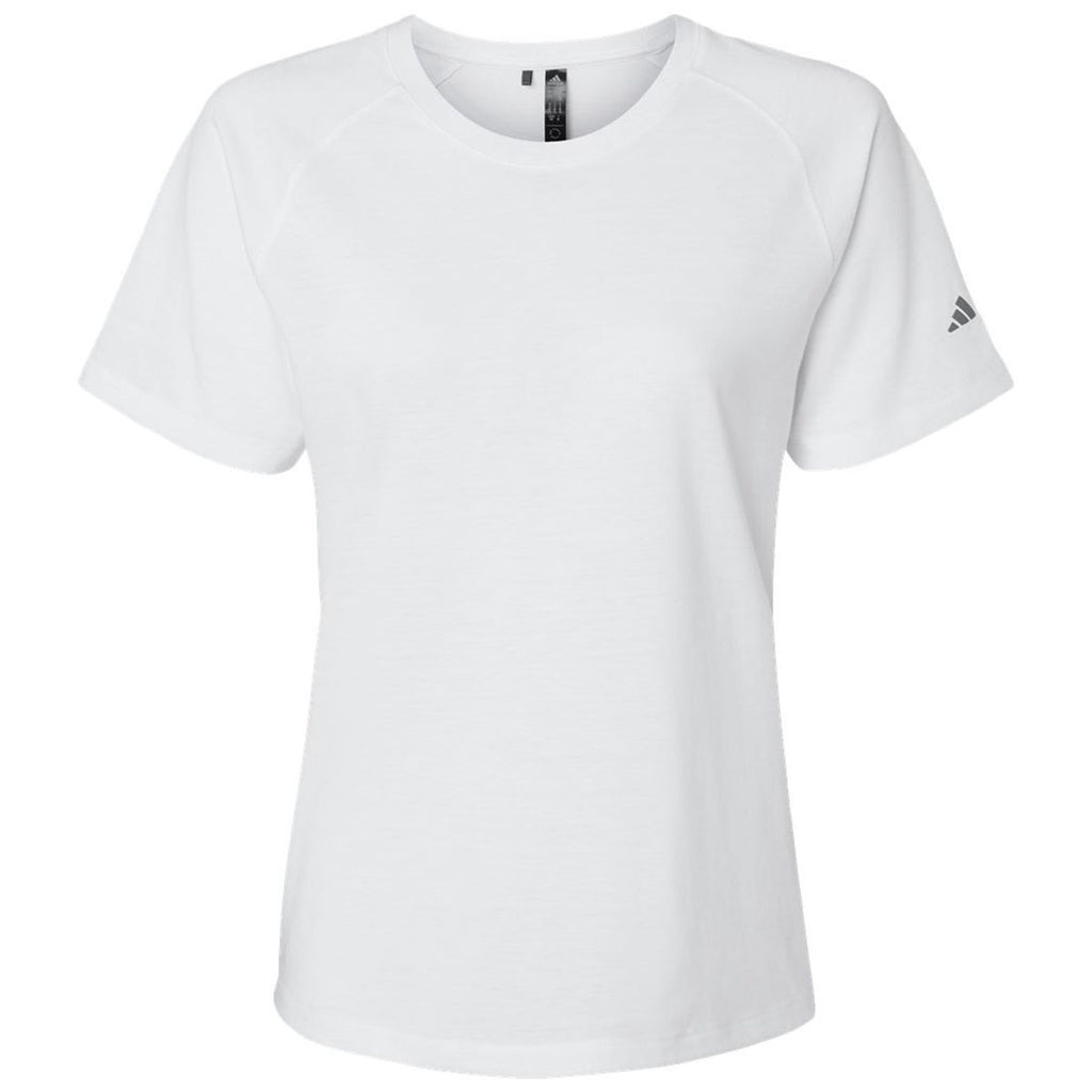 The Adidas Women's White Blended T-Shirt with a custom logo is a must-have for those who like to relax and have a little fun. The regular-fitting tee is highly versatile and looks great during almost any activity. Made of recycled polyester and cotton, the sustainable tee can serve as brand awareness, team gear, or daily wear with ease.This product cannot ship outside of the United States