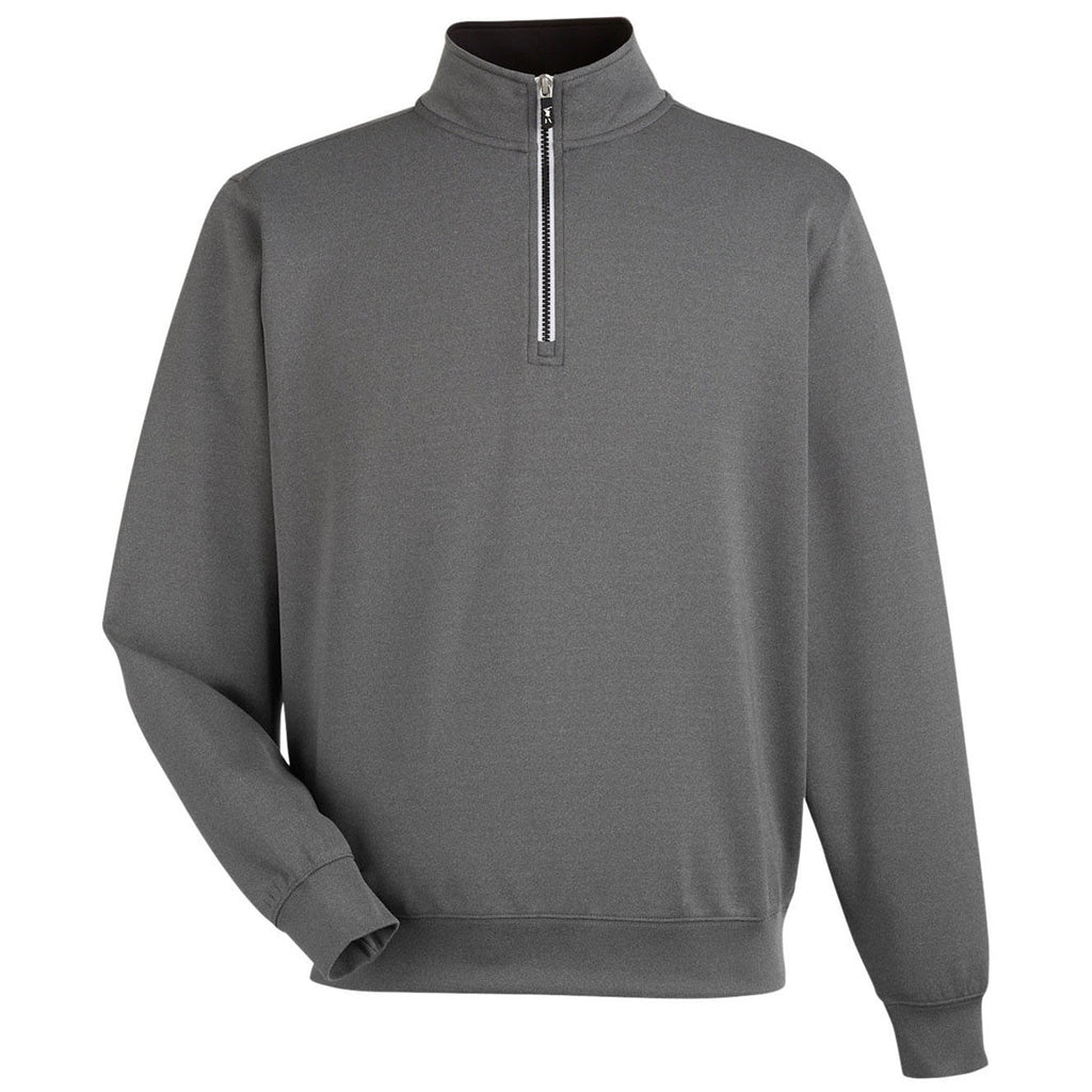 Fairway & Greene Men's Dark Shadow Grey Heather Caves Quarter-Zip Tech Pullover with a custom logo is made of a polyester and spandex blend for some added stretch whether you are playing a quick round of golf, hanging out with friends, or relaxing at home. The UPF 50+ sun protection adds to the appeal for outdoor wear. Great as a gift or promotional item.