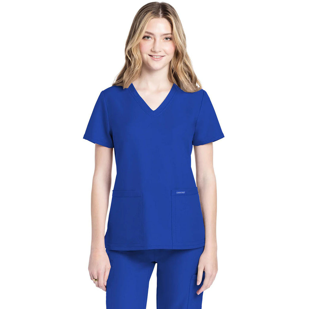 Cherokee Women's Royal 2-Pocket V-Neck Top with a corporate logo is a must-have for those in multiple professions. Perfect for those in the medical field, those who work with animals, or those who provide in-home care, this comfortable option has side vents, antimicrobial and moisture-wicking technology, and roomy patch pockets.