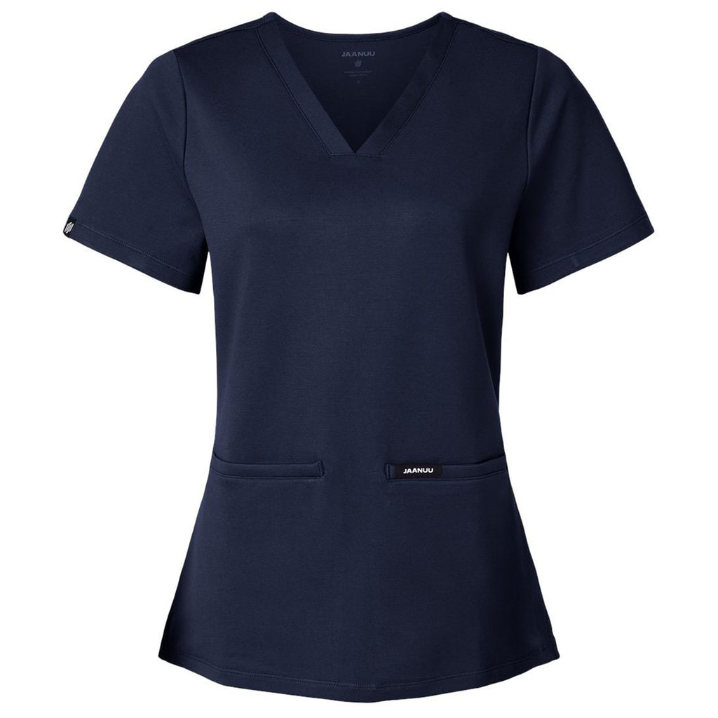 Add a custom logo to the Jaanuu Women's Midnight Navy Cesi Ultrasoft Scrub V-Neck Top for a fashionable option for all your scrub top needs. The slim fitting top has two welt pockets and side vents to keep you comfortable as you see patients, handle emergencies, or hang out at home. A truly versatile option that is perfect for daily wear.Highlights